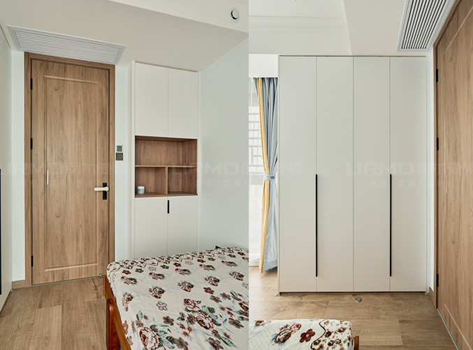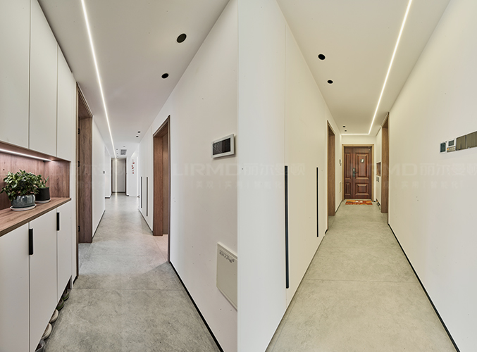 18mm厚杉木芯板,實(shí)木柜體搭配PET膚感柜門,長(zhǎng)廊兩側(cè)分別置鞋柜和儲(chǔ)物柜,