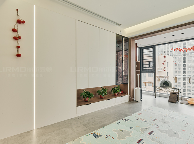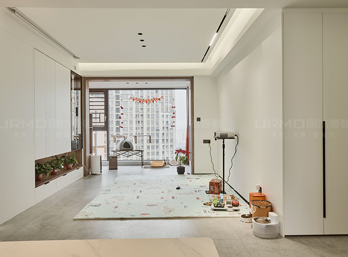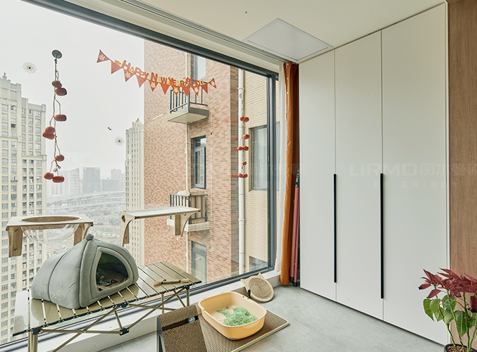 陽(yáng)臺(tái)接客廳通鋪啞光地磚,落地窗保證光照充足,與寵物共享美好時(shí)光。