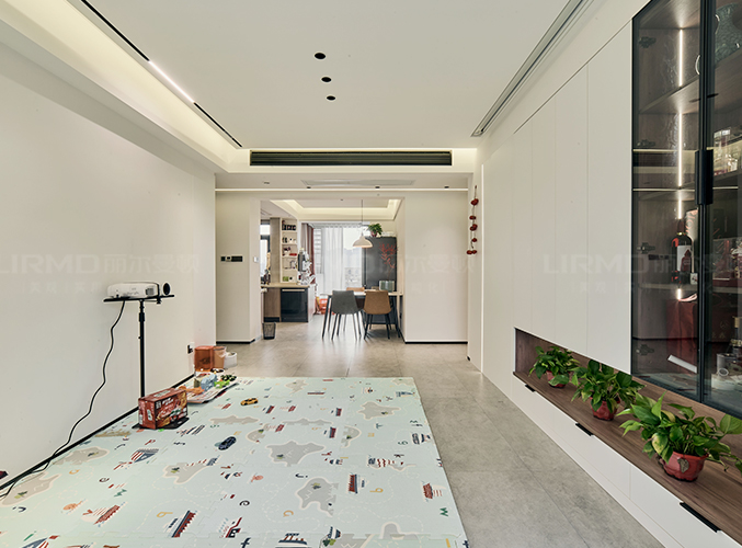 滿墻一柜到頂收納柜+展示柜,升降投影幕布打造去電視化客廳,展現(xiàn)現(xiàn)代化家居生活。