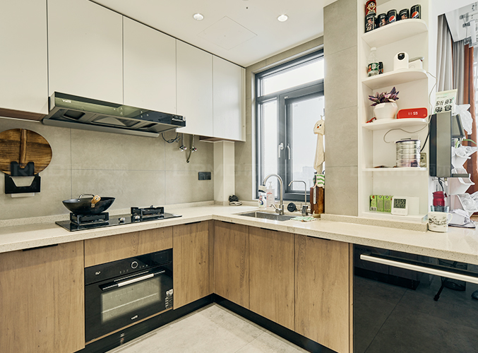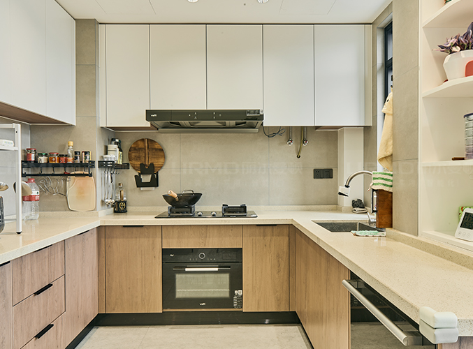 U型大吊柜+地柜,收納大容量,白色搭配木紋簡(jiǎn)單清新。