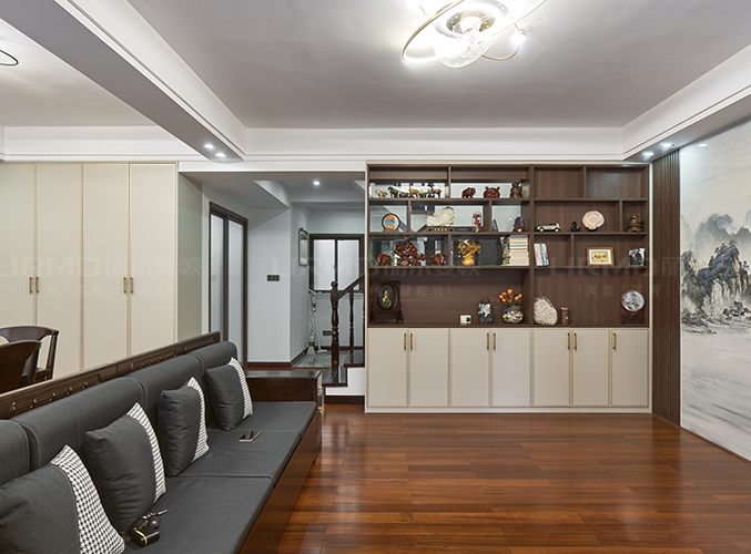 客廳鋪設(shè)木地板搭配山水畫電視墻,吊燈設(shè)計,增強(qiáng)照明實用性的同時又增貼了空間藝術(shù)感。