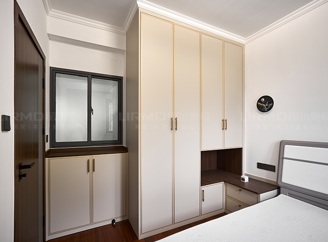 臥室同款造型衣柜,門墻柜一體化,衣柜開放格延伸做床頭柜,整體統(tǒng)一。