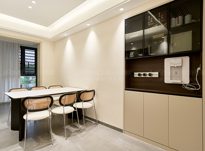 內(nèi)嵌餐邊柜,中間預(yù)留管線機(jī)位,,安裝移動(dòng)插座,,方便電器使用,上方搭配玻璃柜門,