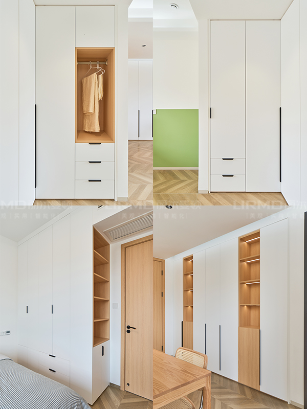 6、冰箱內嵌柜 7、陽臺日雜柜 8、主臥整版大書柜 9、主臥“U”型衣帽間柜 10、兒童房書桌 11、兒童房側面柜體
