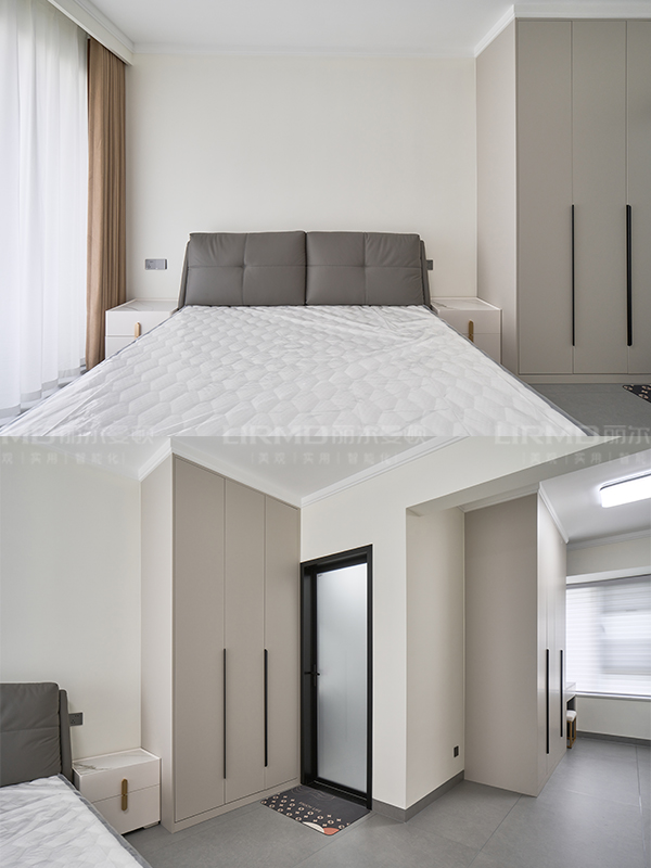 主臥步入式衣帽間+定制梳妝臺、兩個定制浴室柜,以及同色墻板、同色到頂房門)
