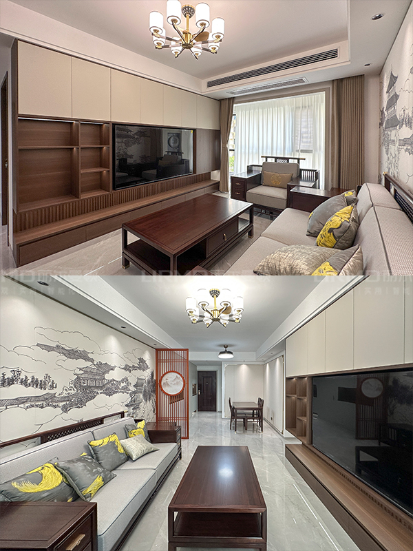 入戶柜與客廳用紅色屏風(fēng)隔斷,連接水墨畫(huà)背景,余韻十足