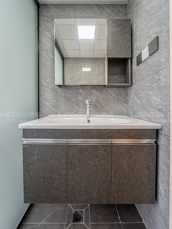 兩個(gè)定制浴室柜,以及同色墻板、同色到頂房門)