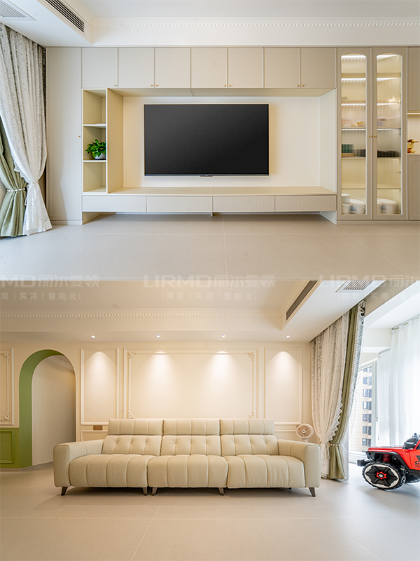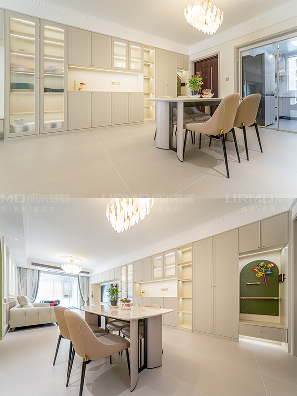 客餐廳墻面采用pu線條及角花作為點綴,搭配牛油果綠,更顯優(yōu)雅復古