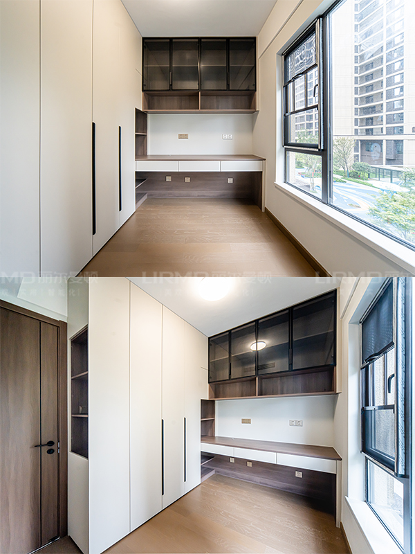 書房采用書桌衣柜一體化設(shè)計,搭配玻璃柜門,更有層次感