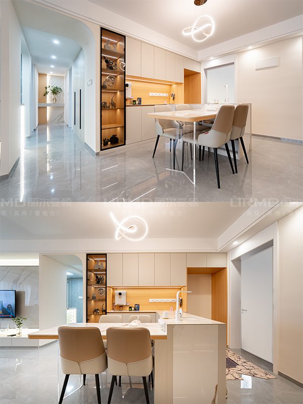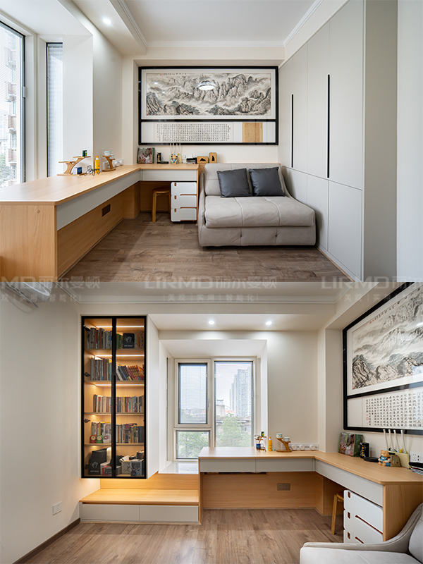 門墻柜一體化設(shè)計(jì),打造全屋同款同色同造型,書房運(yùn)用玻璃柜門的設(shè)計(jì),美觀的同時(shí)實(shí)用感也很絕