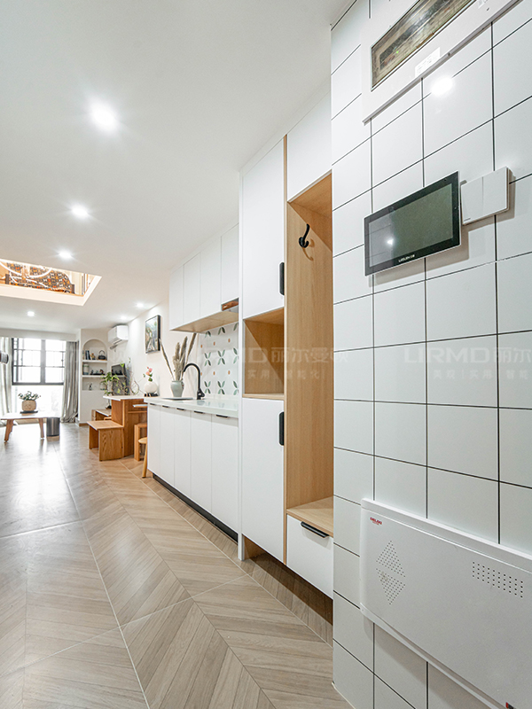 一樓是客廳區(qū),魚骨紋地磚通鋪,全屋原木色搭配白色,電視機(jī)旁邊墻面做了弧形鏤空收納區(qū),美觀又實(shí)用。