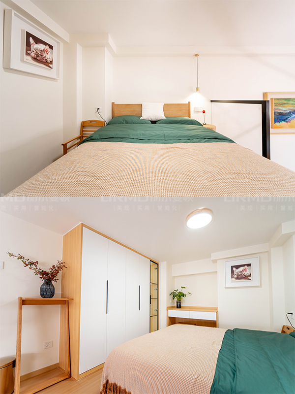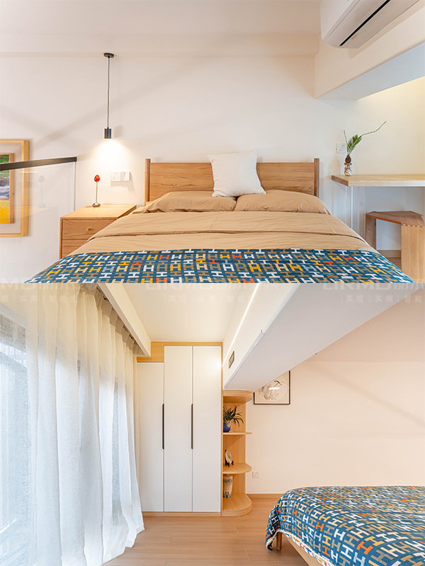二樓使用與柜子顏色相仿的木地板。床、家具、定制衣柜、書桌都采用原木風(fēng),將原木風(fēng)貫徹到底。