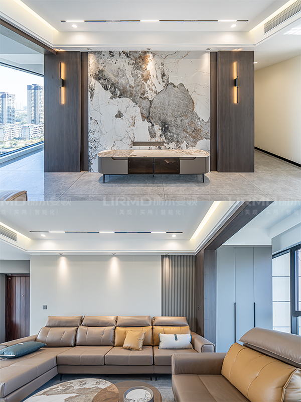 電視背景墻采用巖板裝飾,與整體灰色調相碰撞,更有質感