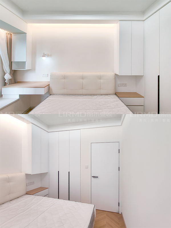 臥室一側(cè)從飄窗延伸打造床頭柜,床頭柜與背景墻材質(zhì)一致視覺上看起來簡單又舒適