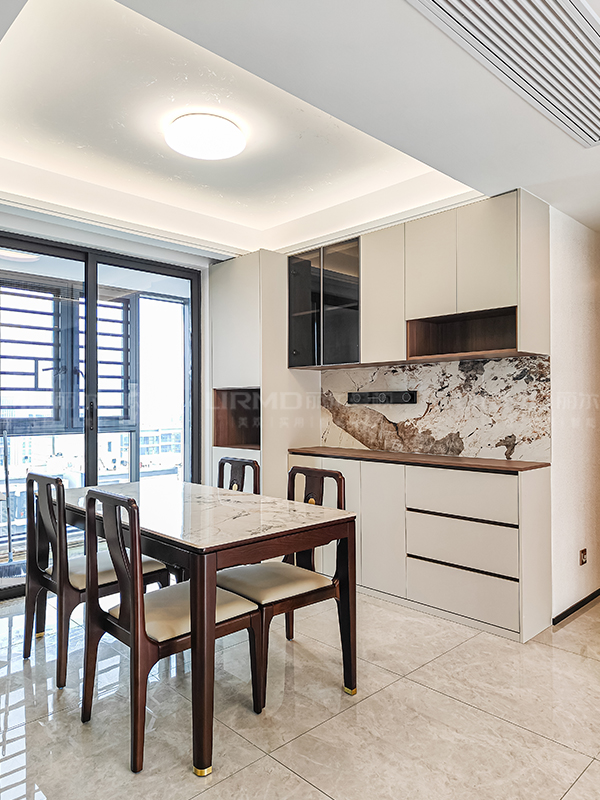 餐邊柜上柜設(shè)置玻璃門,封閉式柜門儲(chǔ)物防塵又通透,后期打掃也更方便