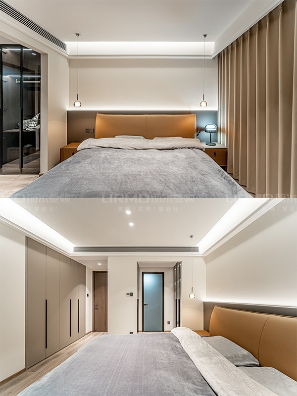全屋門墻柜一體化定制,采用深咖棕+明亮淺灰的搭配,整體空間既不沉悶又更有層次感