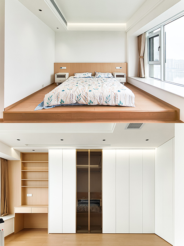 空間充分利用了起來,收納功能強大。木色柜門無把手設計,視覺上感覺很干凈清爽