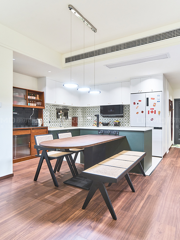 放置一張島臺(tái)餐桌,屹立中央,操作臺(tái)做L型設(shè)計(jì),動(dòng)線合理,操作流暢