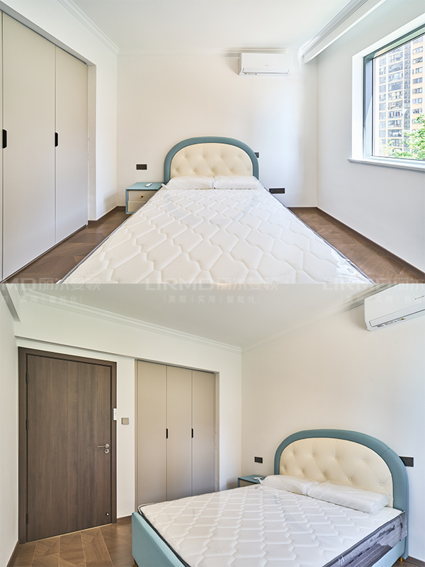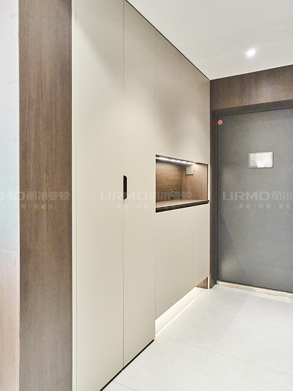采用煙熏尤加利柜體+象牙灰柜門,搭配同色系的房門,門墻柜一體化,真的好高級