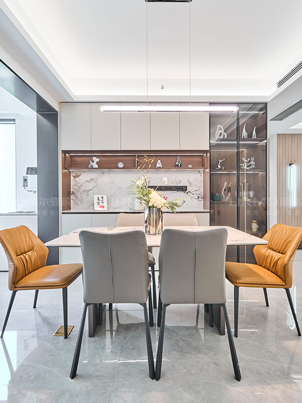 家具軟裝的搭配,不同材質進行混搭,深色的實木餐桌淺色的布藝沙發互相呼應,綠植的點綴為整個空間增添了些許生命力