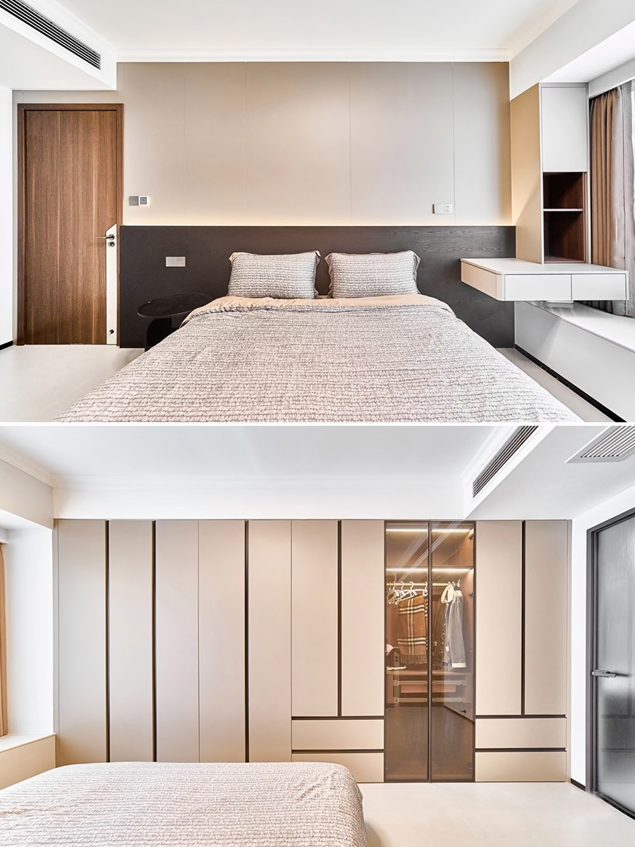 滿墻衣柜通體型材拉手,一門到頂極簡又高級。