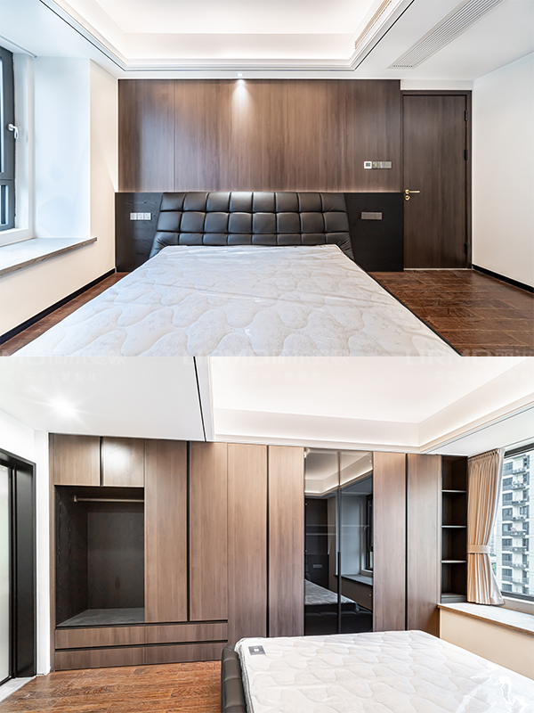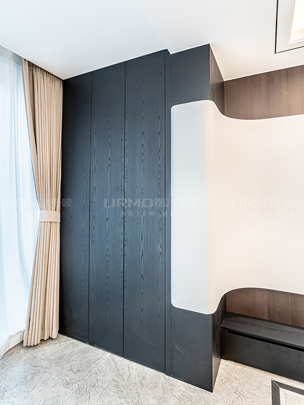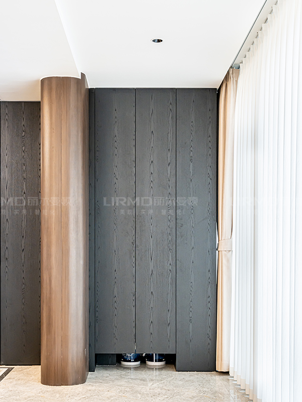 全屋門、墻、柜采用同款煙熏尤加利木紋飾面,避免色差,提升視覺延伸感