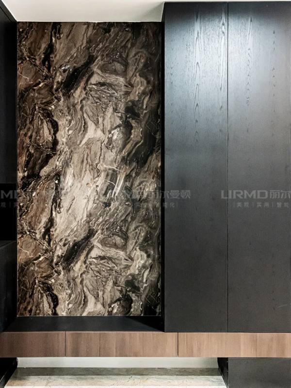 餐廳、書柜處采用仿石材巖板,更具性價比,圓弧懸浮背景墻,圓弧見光面等在其中起到了安全與美觀的結合。